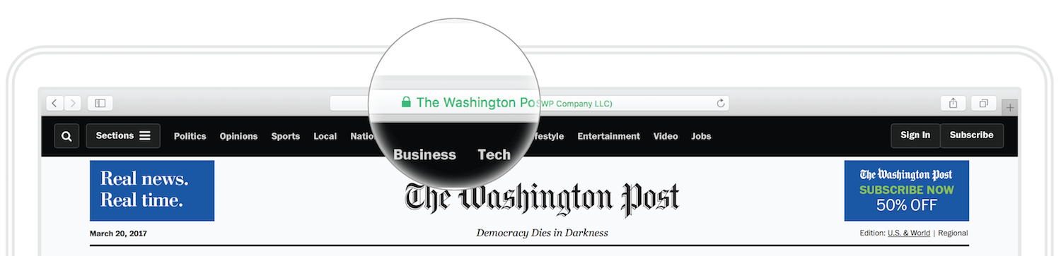 Na imagem acima podemos ver o sinal que indica que esta é uma página segura, protegida com um certificado HTTPs. Além do procedimento de segurança, o The Washington Post deu um passo adiante e também realizou a Papers Validation, que permite exibir o nome da empresa na barra de navegação, em vez da URL padrão da página.