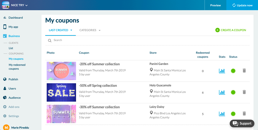 Com esses recursos, você pode ver facilmente qual campanha foi mais bem-sucedida, além de analisar as ações de seus usuários e ajustar sua estratégia de cupons para adequá-la às suas necessidades. Você poderá segmentar melhor seu público e criar potenciais clientes duradouros