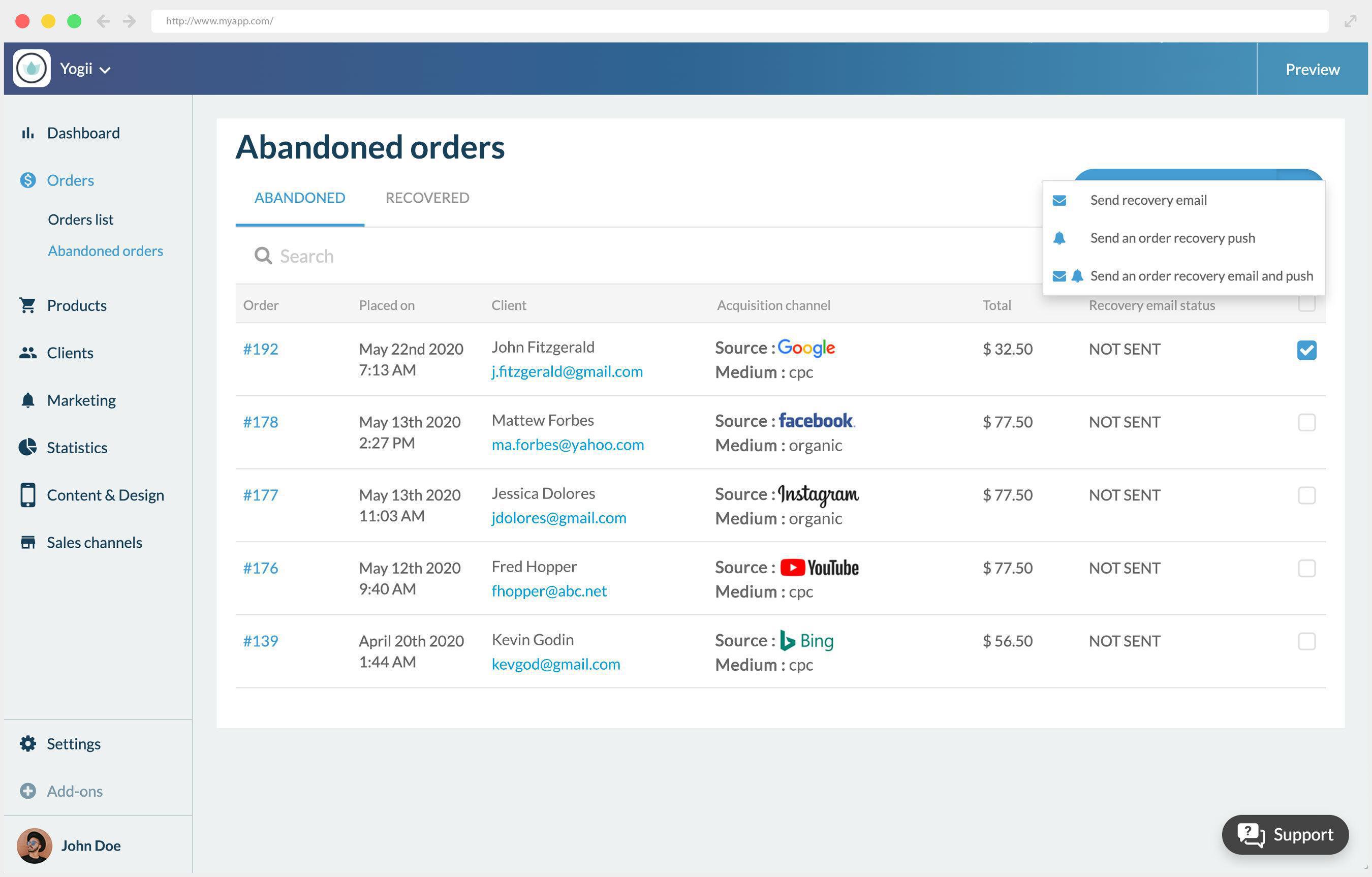 Na lista de pedidos abandonados, você pode enviar um email, uma notificação por push ou ambos, para incentivar seus clientes a finalizarem seus pedidos. Os modelos de mensagem associados a essas ações são obviamente personalizáveis.