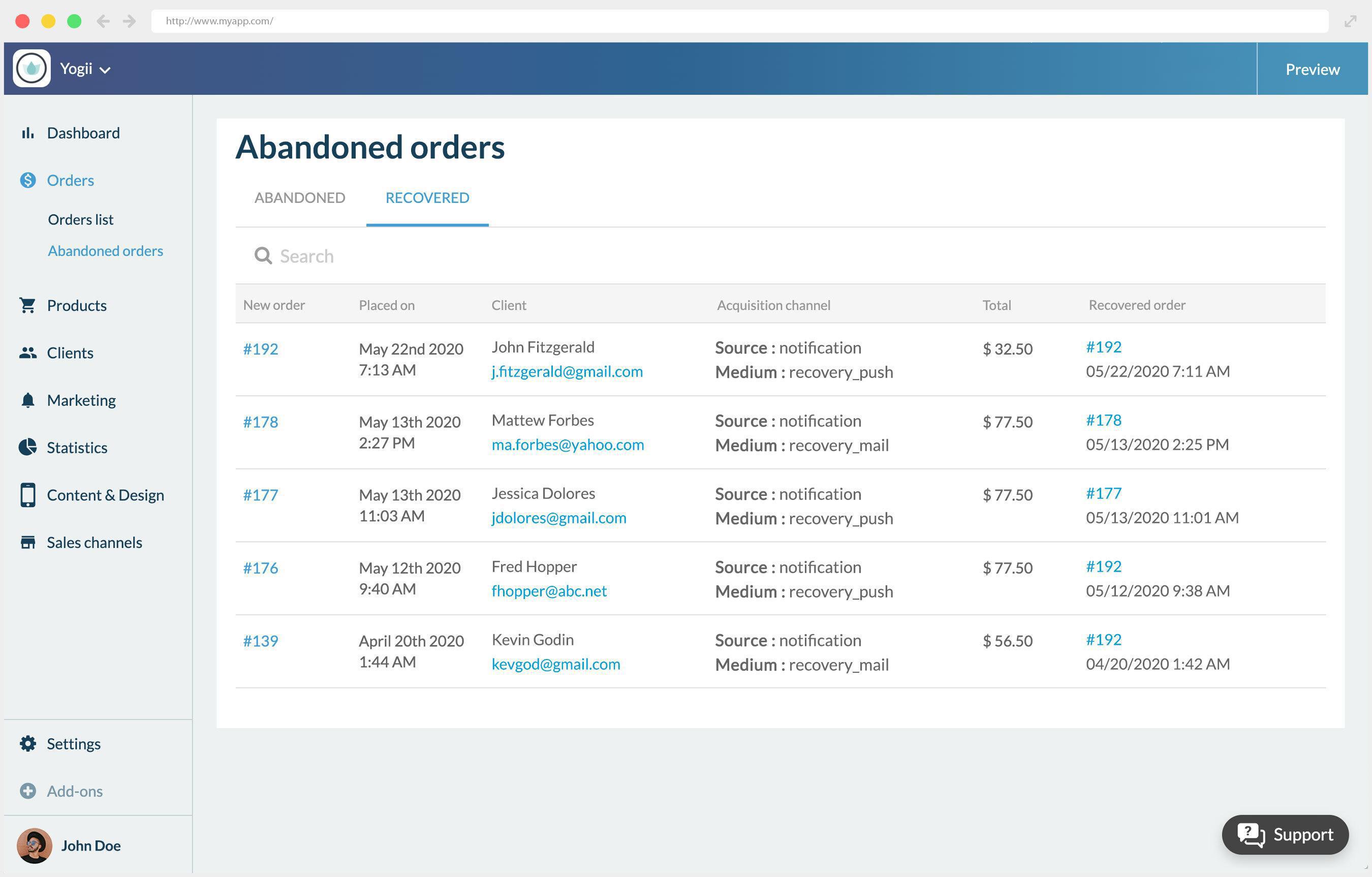 Quando um cliente faz um pedido após receber um lembrete, ele é exibido na lista "Pedidos recuperados". Essa lista informa qual foi o canal de comunicação que conseguiu convencer o cliente a retomar as compras.