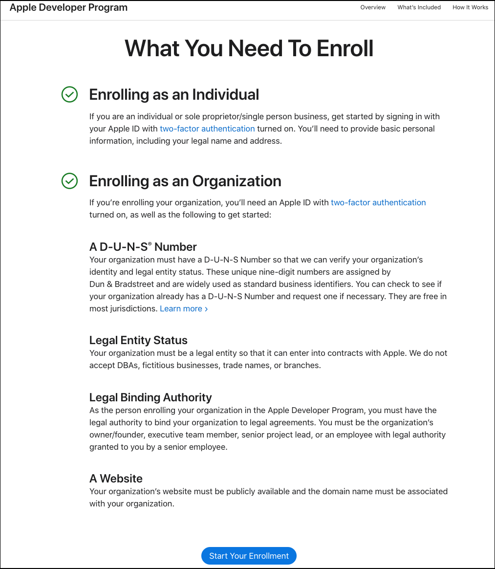 Depois que seu cliente criar seu ID Apple (se ainda não tiver feito isso), ele precisará criar uma conta de desenvolvedor Apple. Aqui está o link direto para começar: https://developer.apple.com/programs/enroll/