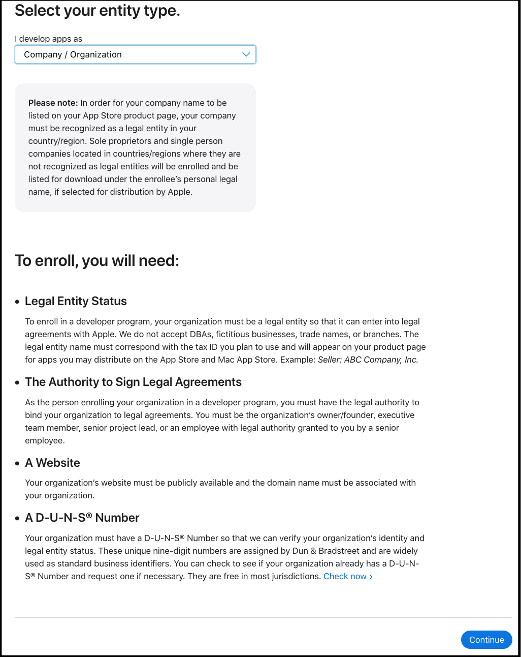 Importante: Mesmo se o seu cliente for uma empresa individual ou uma associação, ele deve criar uma conta de "Organização". Primeiro, a Apple verifica, então eles podem exigir que você volte para uma conta da "Organização" mais tarde (perda de tempo garantida...). Além disso, com uma conta "Organização", você pode ser adicionado à Equipe do cliente, que deixará suas mãos livres para gerenciar publicações e outras atualizações no futuro. Isso dará a você acesso ao App Store Connect e [Developer.apple.com]urlblank:Developer.apple.com .