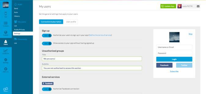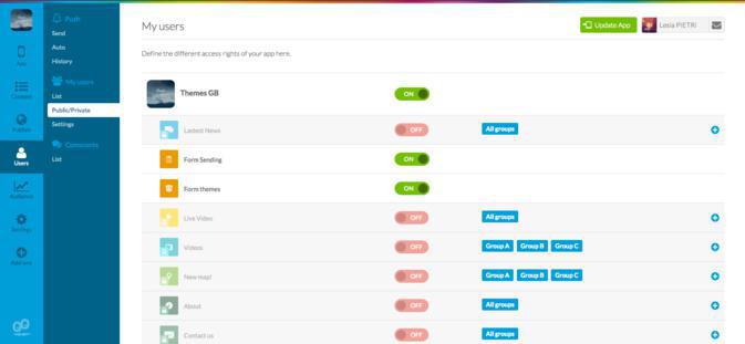 Para o fazeres, tens de aceder ao segundo menu da tab "My User" do menu Publico/Privado. É aqui que deves gerir as restrições e acessos da tua app.